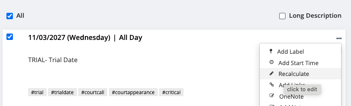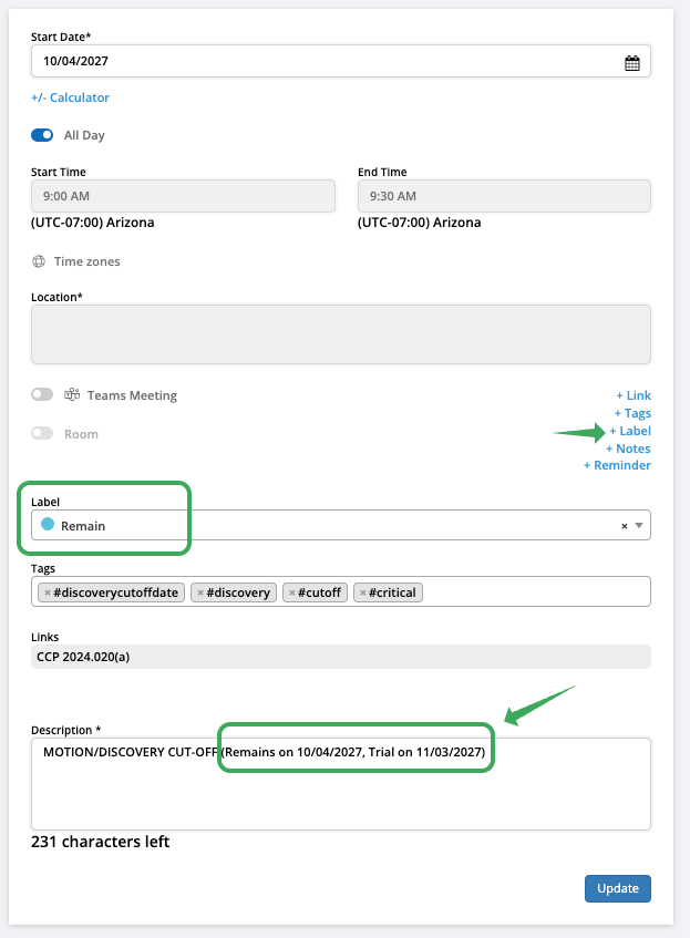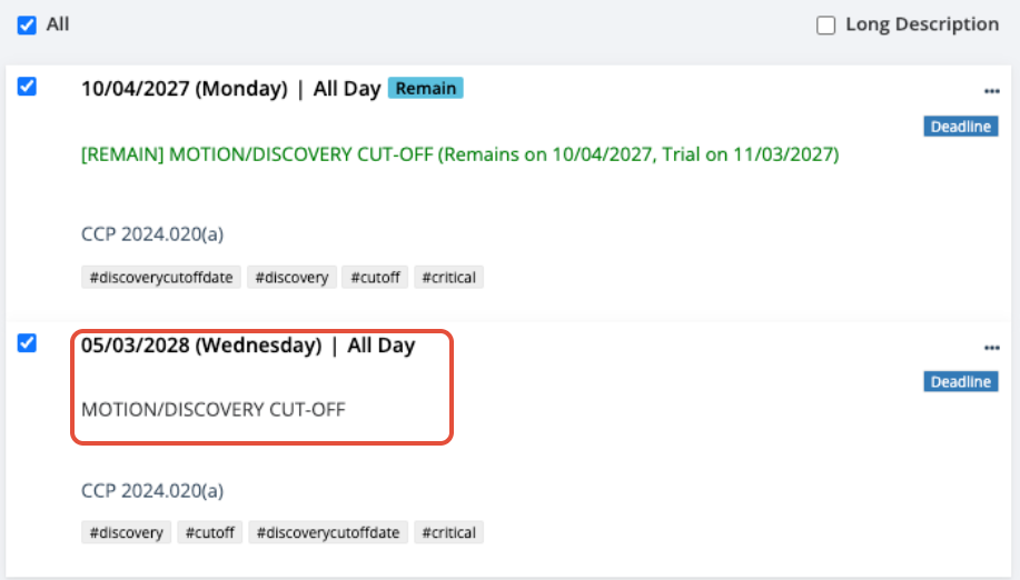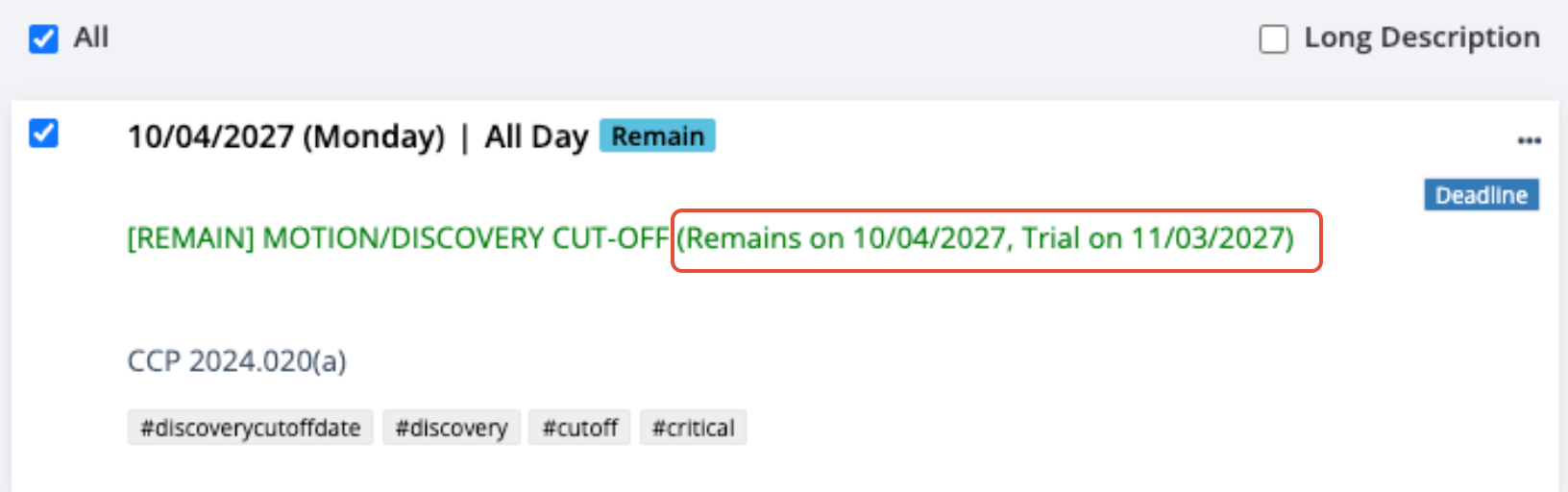 *Adding a note (e.g. DL Remains 10/04/27) disconnects the deadlines from the Trial Calculator