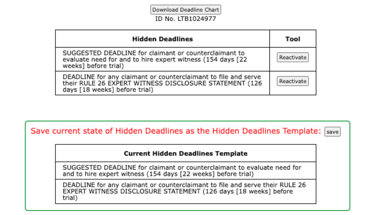 NOTE 2: This feature does not allow you to “edit deadlines” and save as default for a rule-set. Please DO NOT edit deadlines. If you would like to propose a deadline wording change please email support@lawtoolbox.com so we can look at making your proposed deadline change apply to the rule-set for all our customers. We value your feedback.