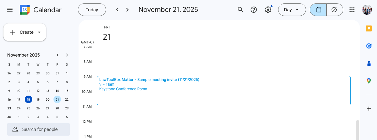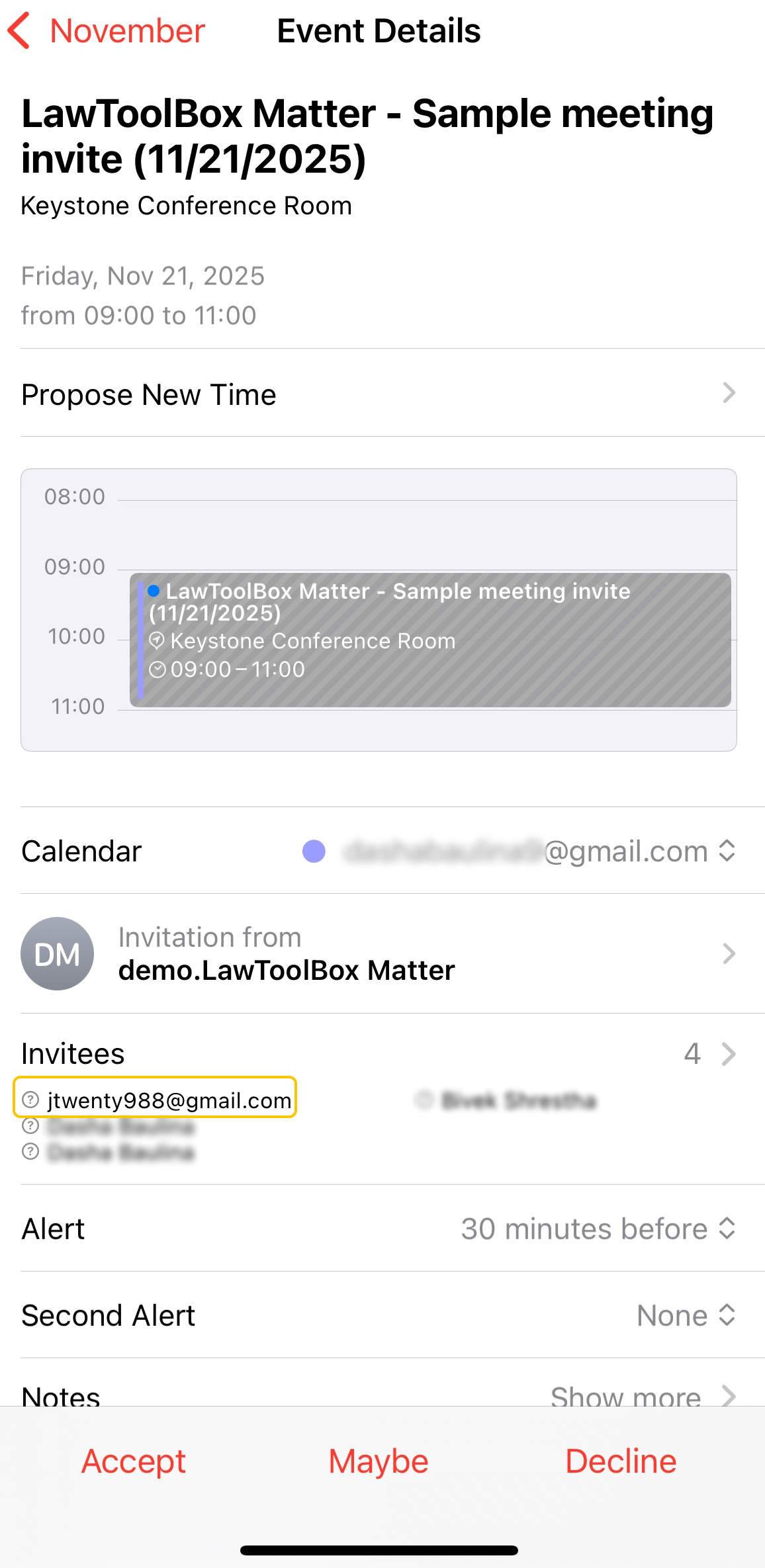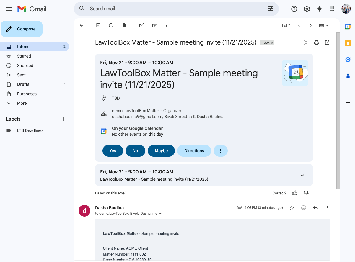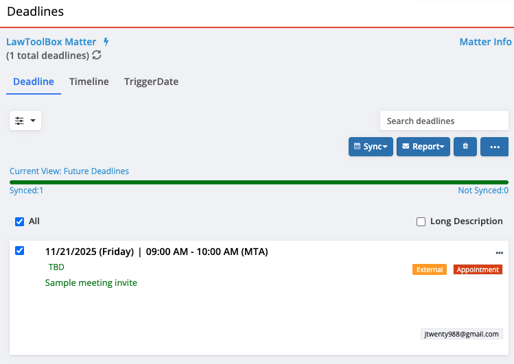 Only licensed LawToolBox users with @yourdomain.com can seamlessly get update their calendars, receive dynamic updates when events change, and leverage reminders and reports.