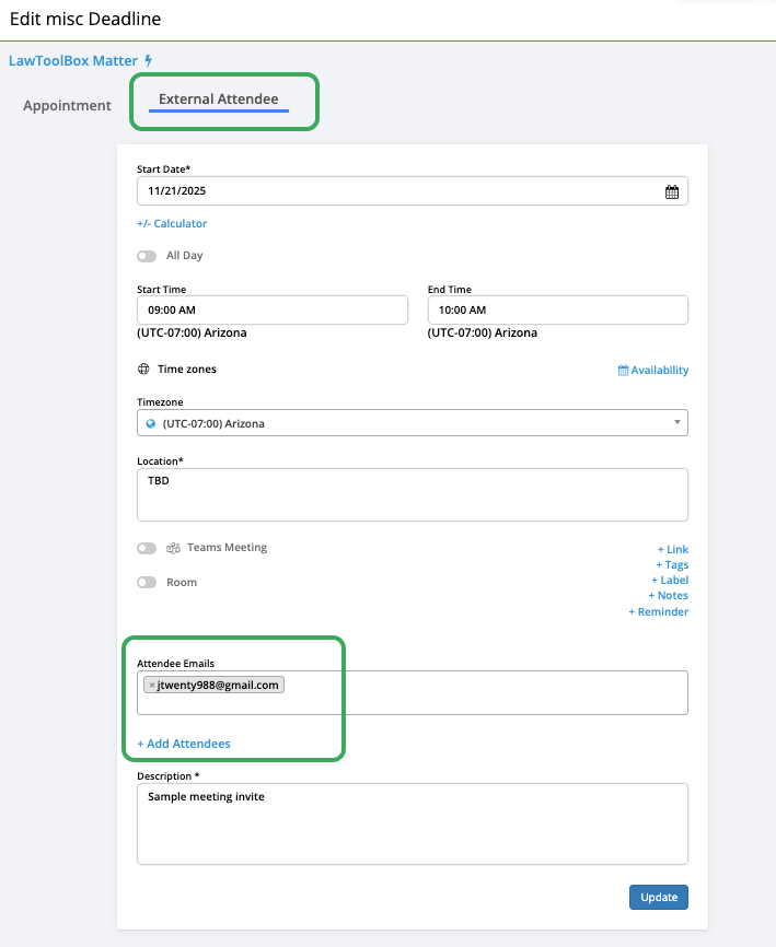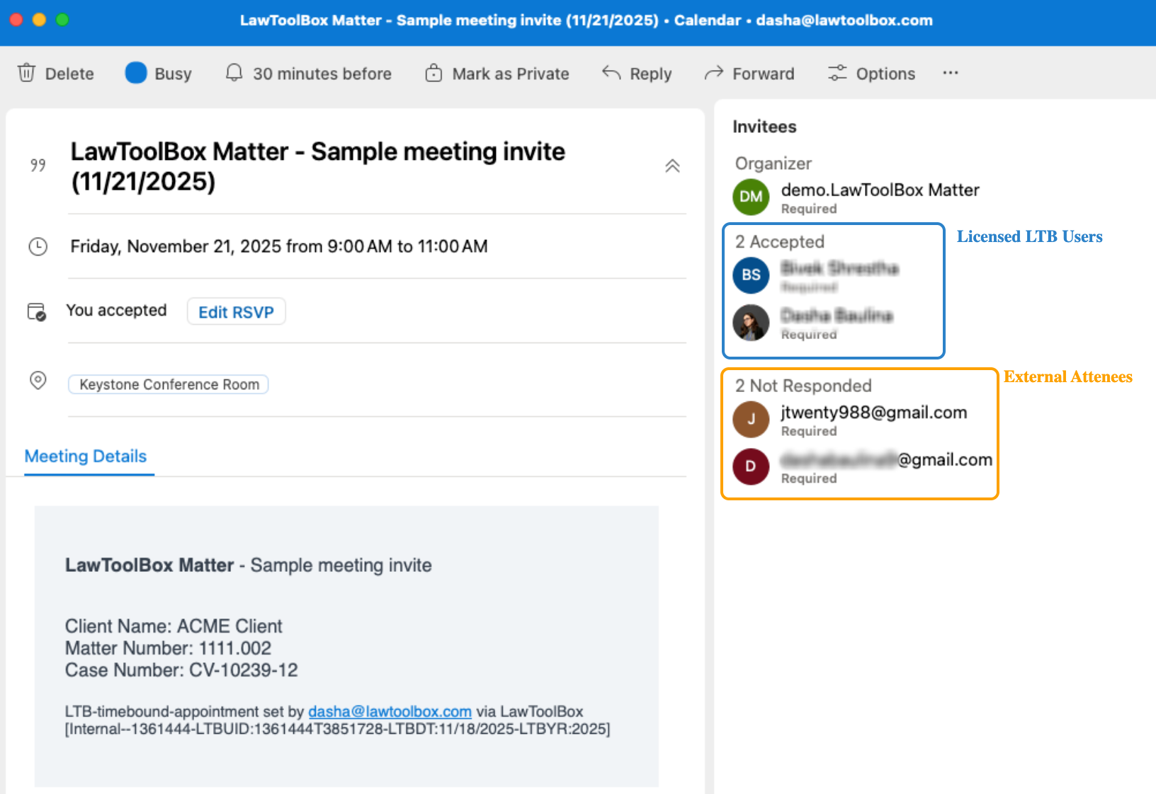 Deadline or appointment in outlook will include External Users (gmail) + Matter members (Licensed Users)