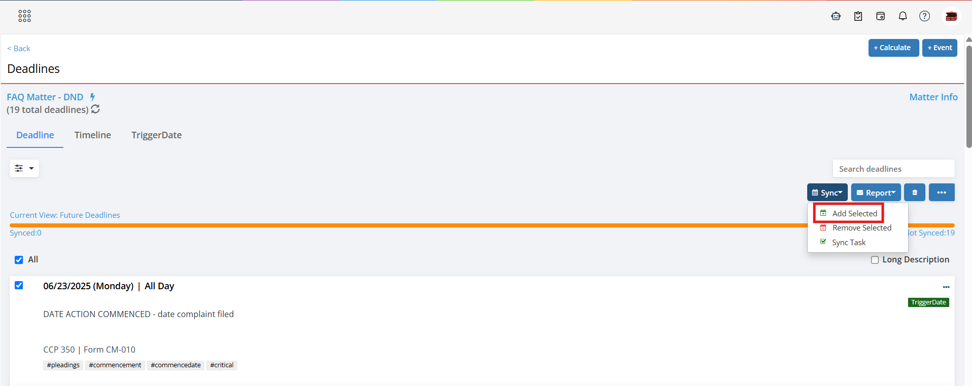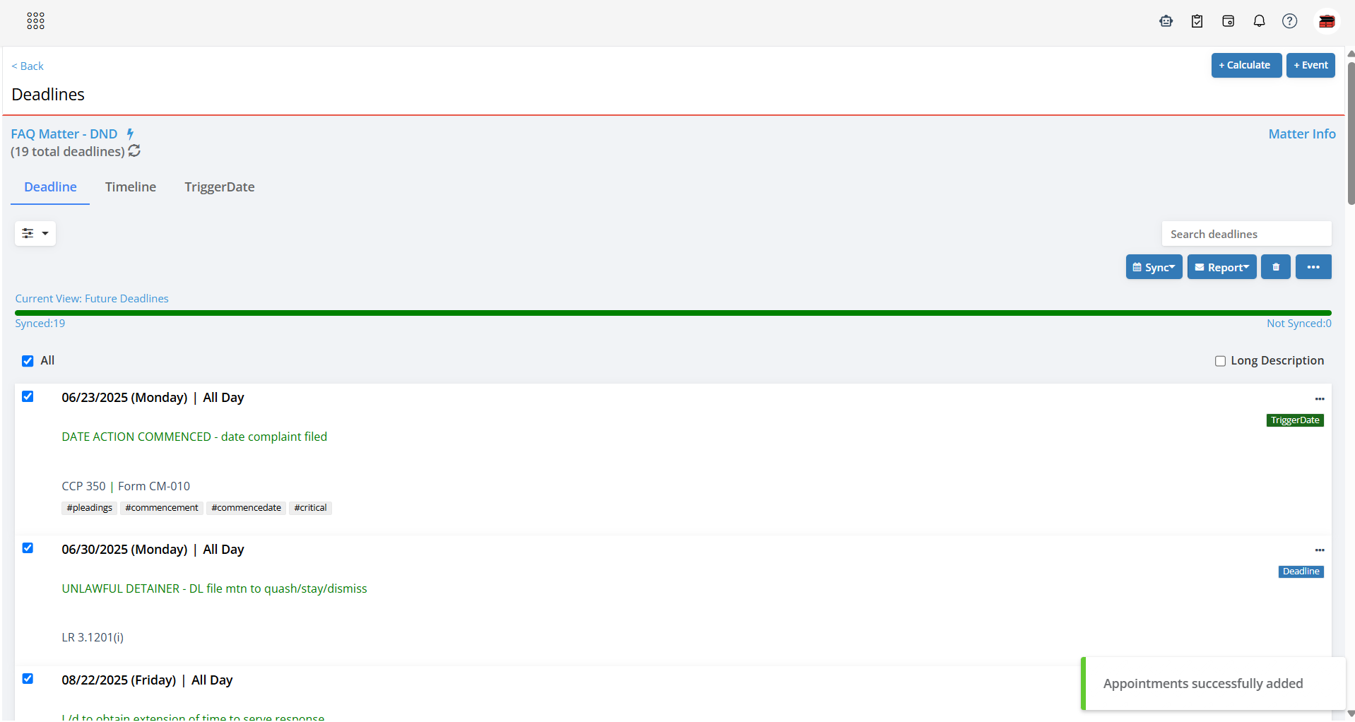 LawToolBox calculated events allow you to review the deadlines before adding them to the calendar.