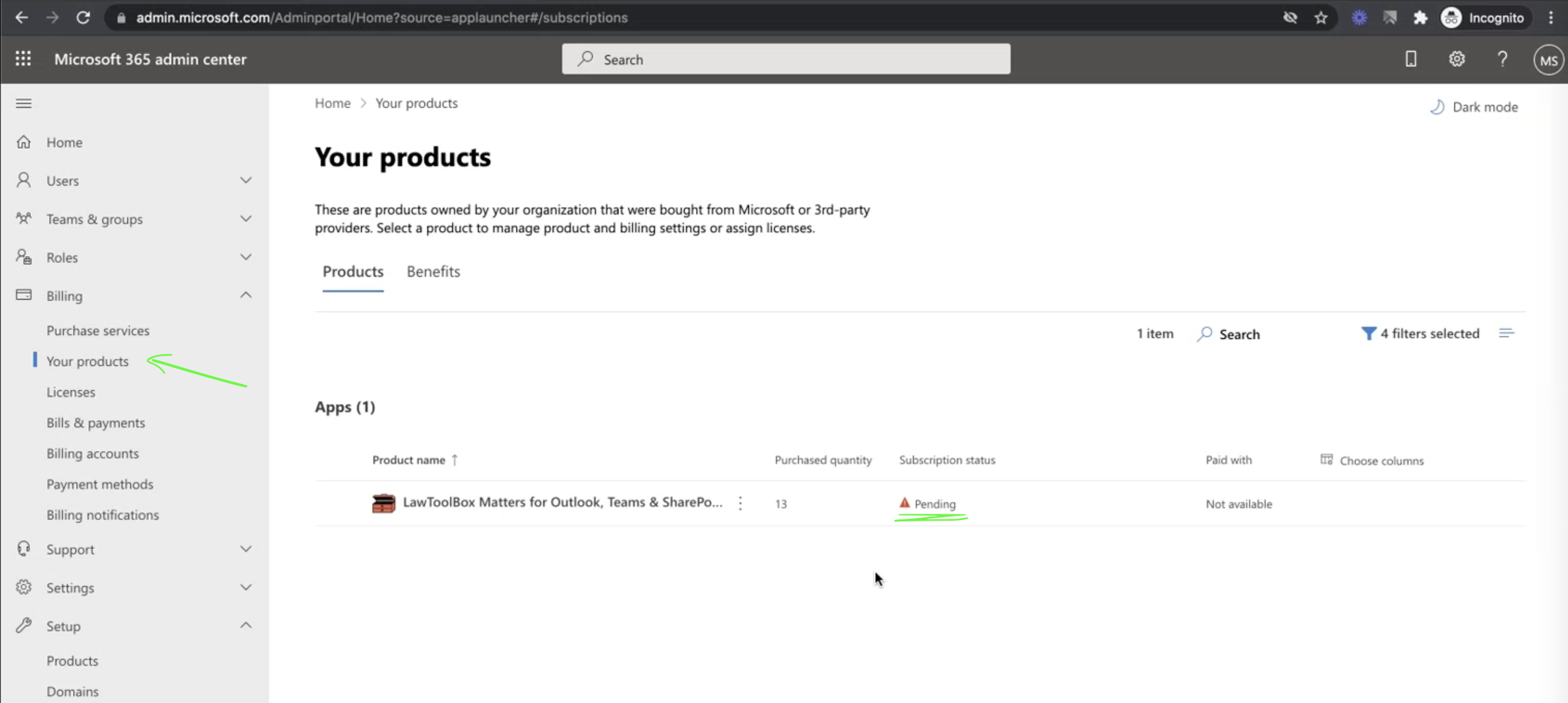 Once the order provisions you will see it in the client M365 admin center under “Products” as “Pending”
