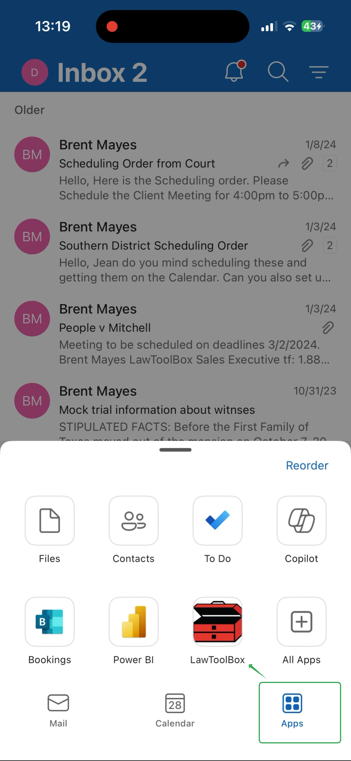 1: How to access the LawToolBox app in Mobile Outlook